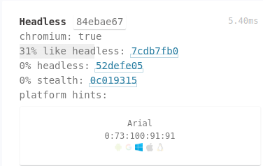 import undetected_chromedriver as uc import time options = uc.ChromeOptions() options.headless = False driver = uc.Chrome(options=options) driver.get('https://abrahamjuliot.github.io/creepjs/') time.sleep(60) driver.quit()위 사이트에 접속했을 때, 0% headless가 뜨면 성공한 것이다.
