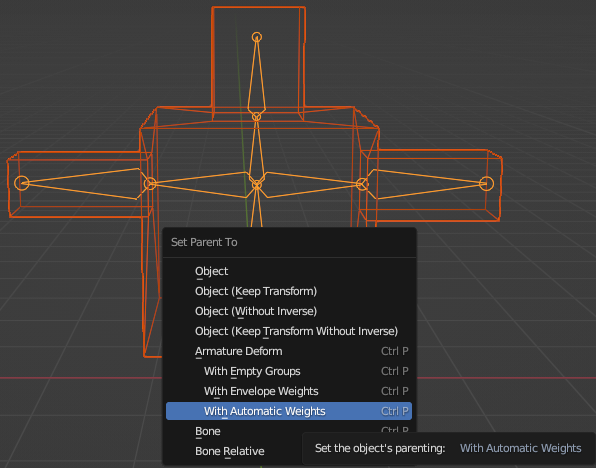 object와 armature를 합치는 방법: Object Mode에서 object를 선택 후, shift로 armature도 같이 선택 후 Ctrl P를 누르고