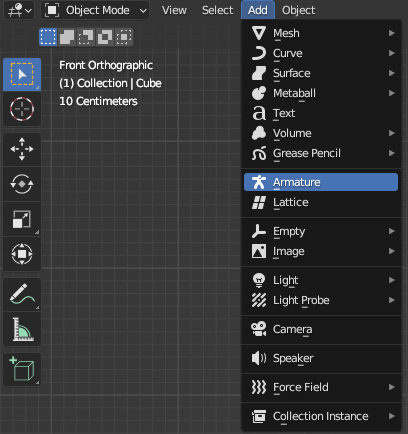 Object Mode에서 Add - Armature를 하면 Bone을 추가할 수 있다.